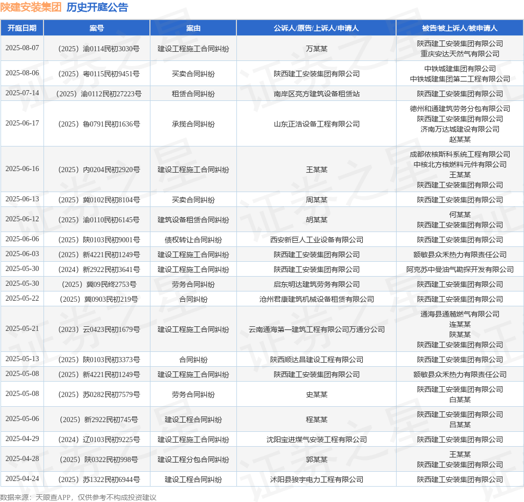 案号:(2025)鲁0791民初1636号审理法院:潍坊高新技术产业开发区人民法院案由:承揽合同纠纷当事人信息: 原告/上诉人:山东正浩设备工程有限公司 被告/被上诉人:德州和通建筑劳务分包有限公司、陕西建工安装集团有限公司、济南万达城建设有限公司、赵某某开庭日期:2025年6月17日根据统计,近一年内以陕西建工安装集团有限公司为当事人的历史开庭公告有163则,其中案由为“建设工程施工合同纠纷”的公告以43则居首,其次为“买卖合同纠纷”有27则,“建设工程分包合同纠纷”有18则。历史开庭公告(前20条)如下: